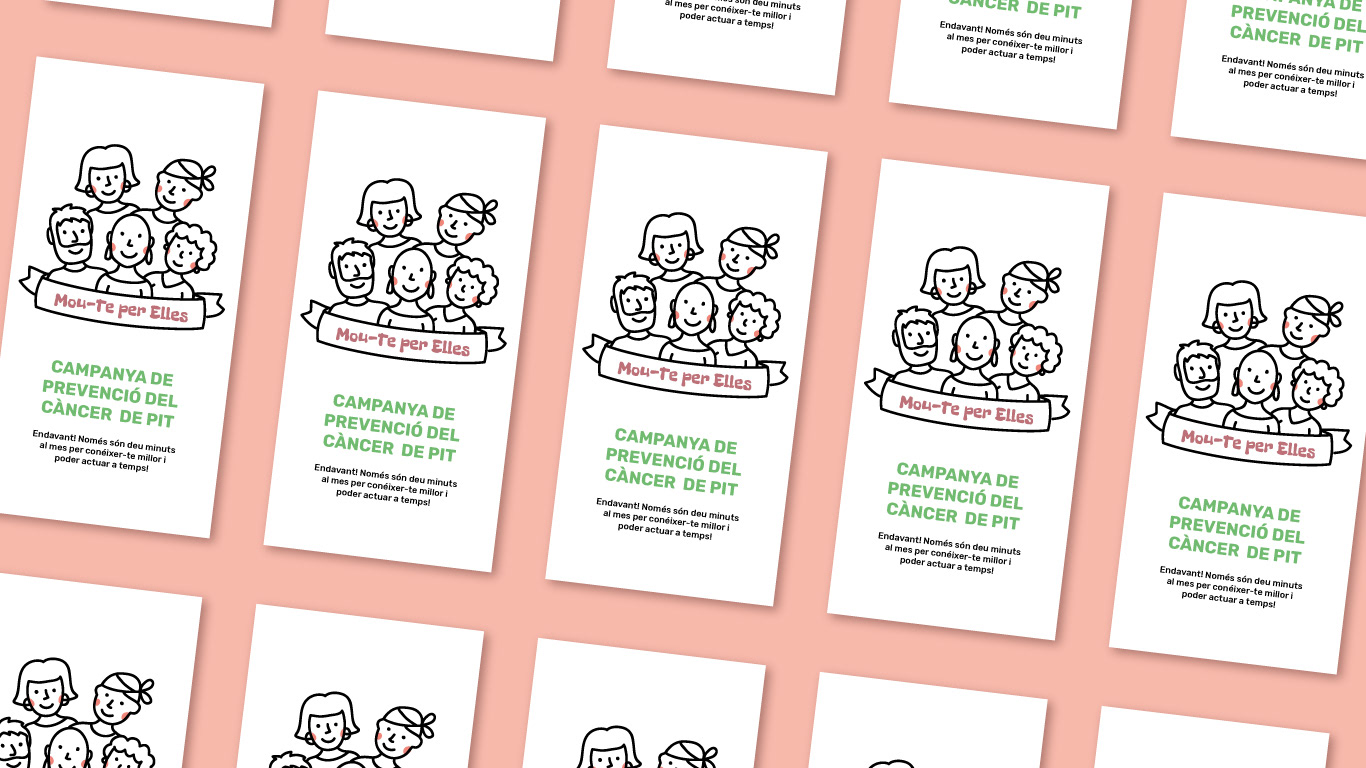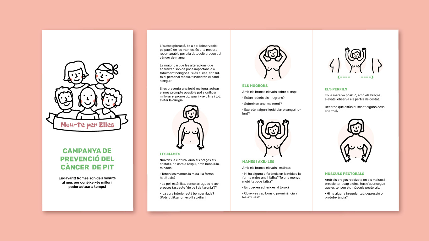 Imagen de campaña y maquetación de díptico con ilustraciones. "Mou-te per elles" es una asociación local, que apoya la investigación del cáncer de mama, organizando eventos desde 2017.