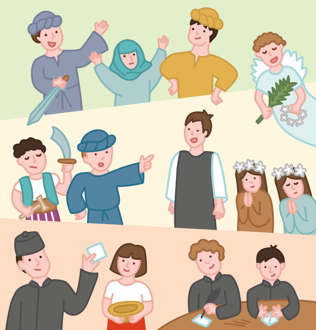 Diseño de personajes principales (Aïna la dolçaina i Pasqual el tabal), storyboard, ilustraciones y portada con lettering (letra dibujada).
